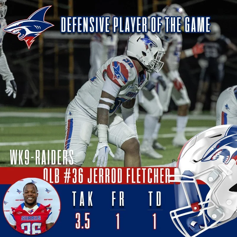 Jerrod no doubt came in and was a spark for the defense with his continuous pressure on the quarterback. Biggest play was made in the backfield as Jerrod scoop and score to tie the game and ultimately lead the Sharks to a win against the East Penn Raiders!
