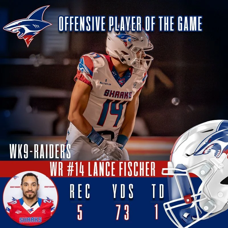 The Shark council has chosen Lance Fischer as the honorary captain for the playoffs divisional round against the Tri-County Owls. Let's congratulate #20 Wide Receiver, Lance Fischer. The Sharks will be playing on Saturday, October 7th, at the Edison Jets home field.