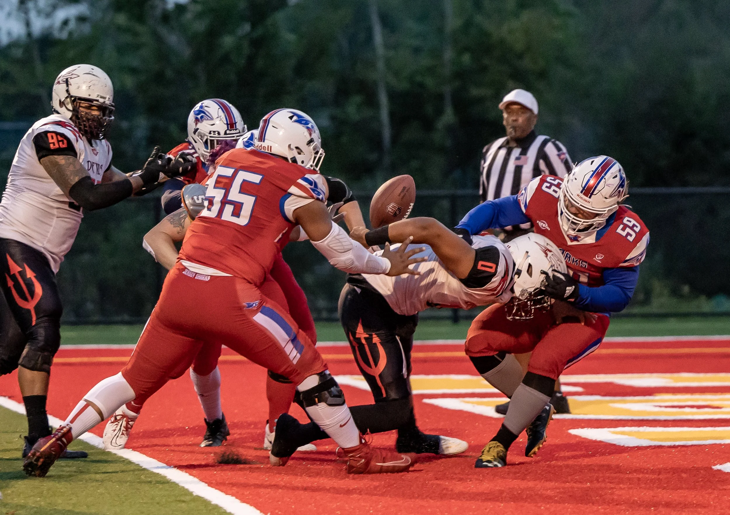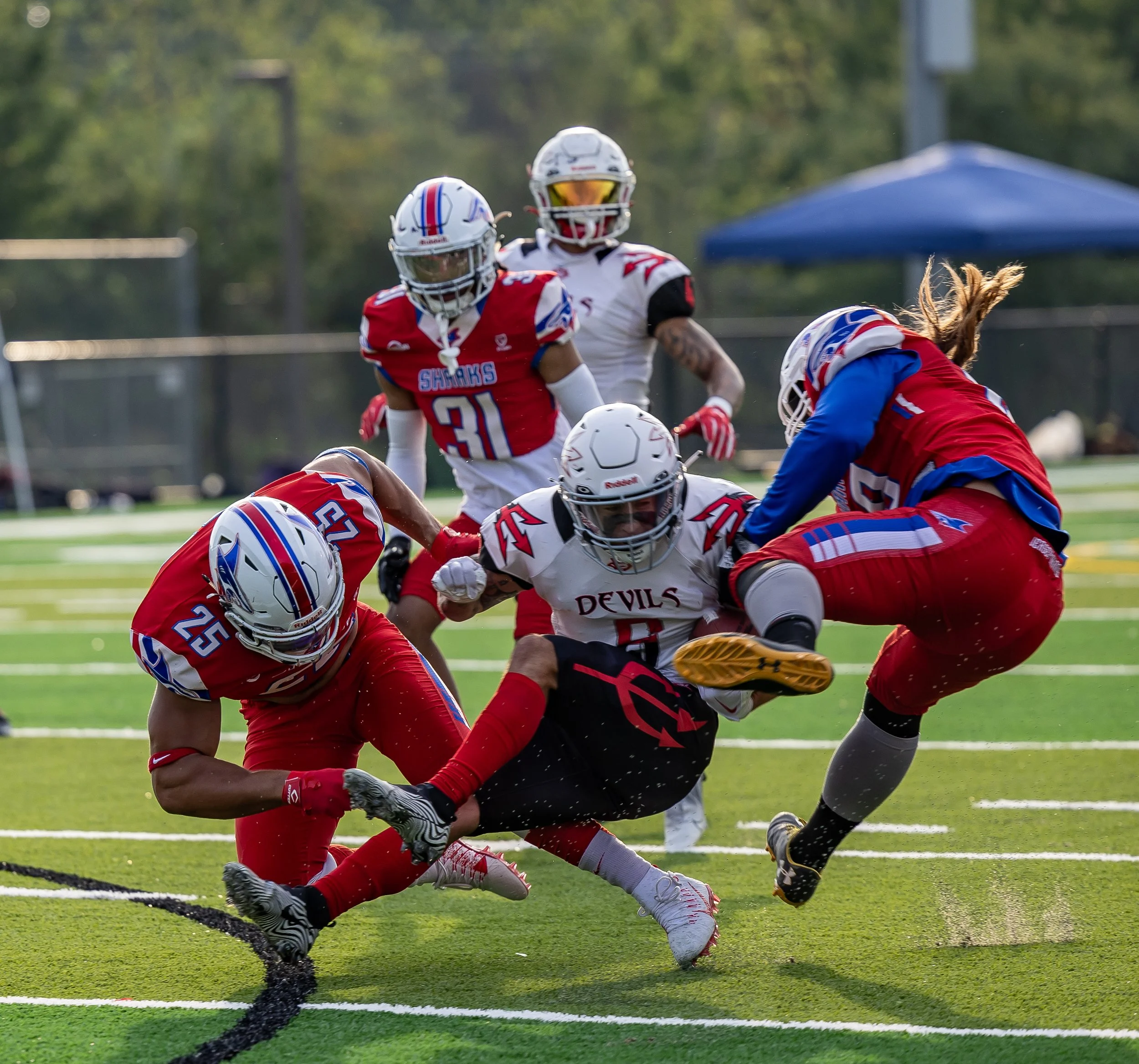 In week 3 versus Long Island Red Devils, we have our first Co-Offensive Player of the Game! Steven was the ground game that moved the chain on the field with ten carries and over 100 yards and a touchdown. Let’s congratulate Steven Jones Jr. on catapulting the Shark attack in a 26-0 victory!