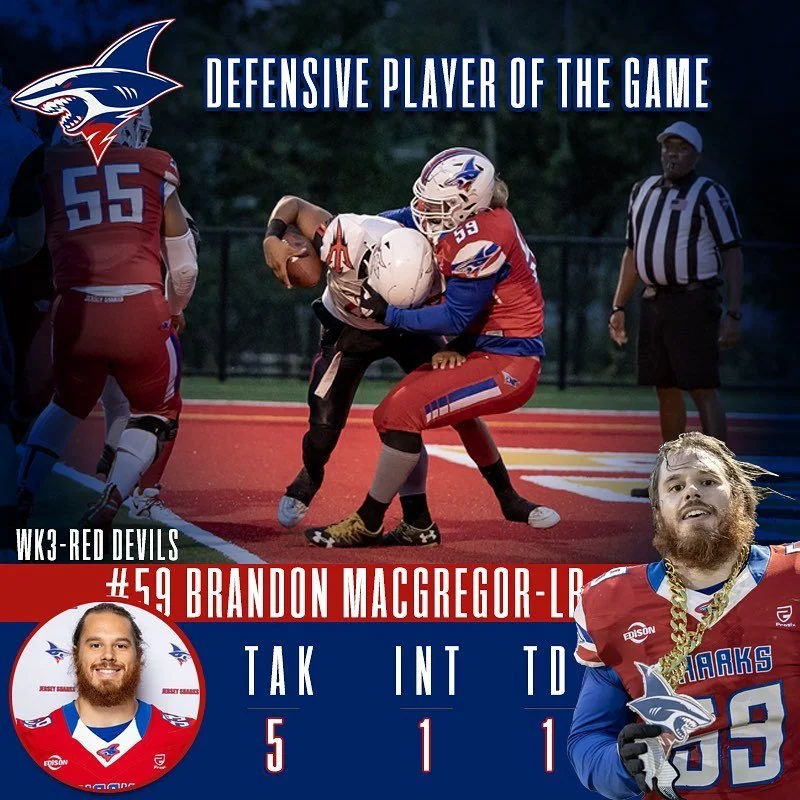 Defensive Player of the Game versus the Long Island Red Devils goes to Brand MacGregor. Brandon’s timely interception for a touchdown in the fourth quarter helped seal the game for the Sharks!